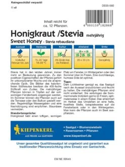 Das Honigkraut ‚Sweet Honey‘ ist eine unkompliziert wachsende Topfpflanze für die Fensterbank, Terrasse oder den Balkon. Es handelt sich um ein mehrjähriges Süßkraut aus dem Kiepenkerl Profi-Line-Programm, welches in Töpfen auf der vollsonnigen Fensterbank von Februar bis Juni vorgezogen werden kann. Die Pflanze erreicht eine Wuchshöhe von ca. 30 cm. Ihre kalorienarmen Blätter haben die rund 400-fache Süßkraft von Zucker. Es kann ganzjährig geerntet werden und treibt immer wieder neue Blätter aus, wenn regelmäßig gegossen und einmal nachgedüngt wird.