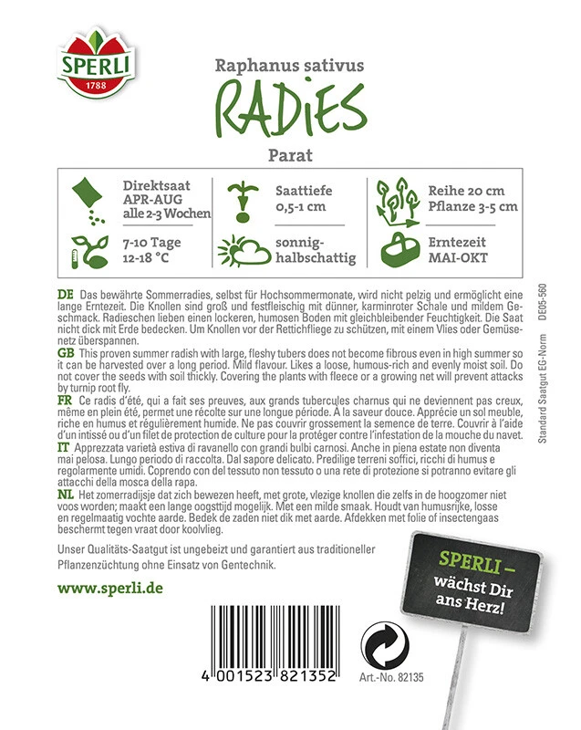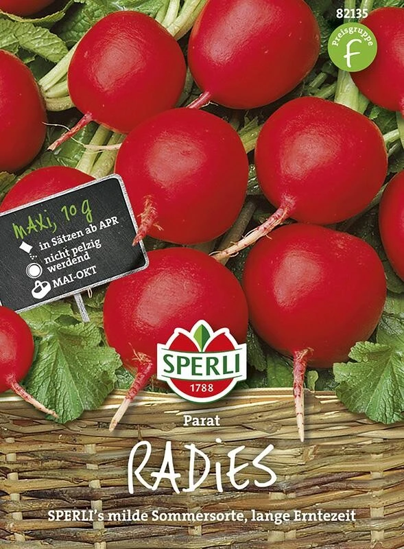 Große, besonders festfleischige Knollen, die nicht pelzig werden, bildet das Radies ‚Parat‘ von SPERLI aus. Die Sorte ist für Folgeaussaaten perfekt geeignet, weshalb sich der Griff zum MaxiPack mit insgesamt 10 g Saatgut lohnt. Von April bis August können die Samen an einer sonnigen bis halbschattigen Stelle alle 2 bis 3 Wochen ausgesät werden. Die karminroten Knollen mit dünner Schale und mildem Geschmack reifen schnell heran und können in der Küche auf verschiedenste Weise verwendet werden. Ob zum Garnieren, als Rohkost, in Salaten oder auf Broten – in der Zubereitung sind der Kreativität kaum Grenzen gesetzt!