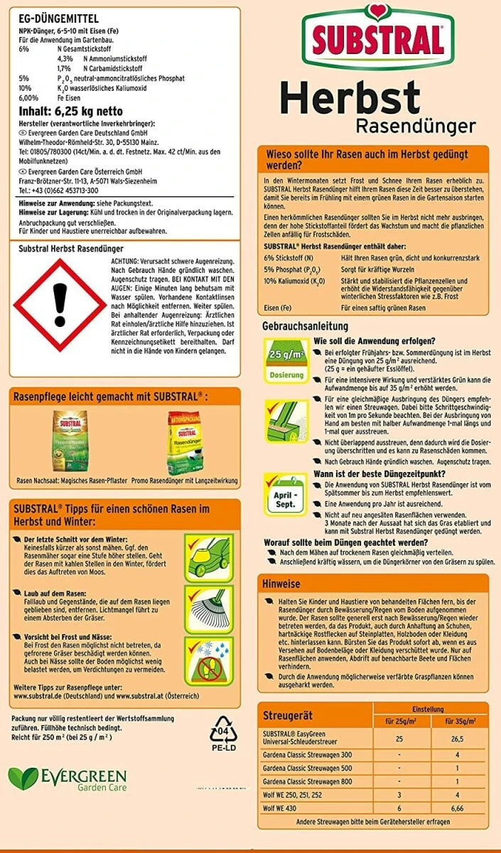 Die Anwendung von Substral Herbstrasendünger ist vom Spätsommer bis zum Herbst empfehlenswert. Eine Anwendung im Jahr ist ausreichend.